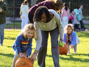 Sari Cooper ’29 plays roll the pumpkin with a kindergarten student.